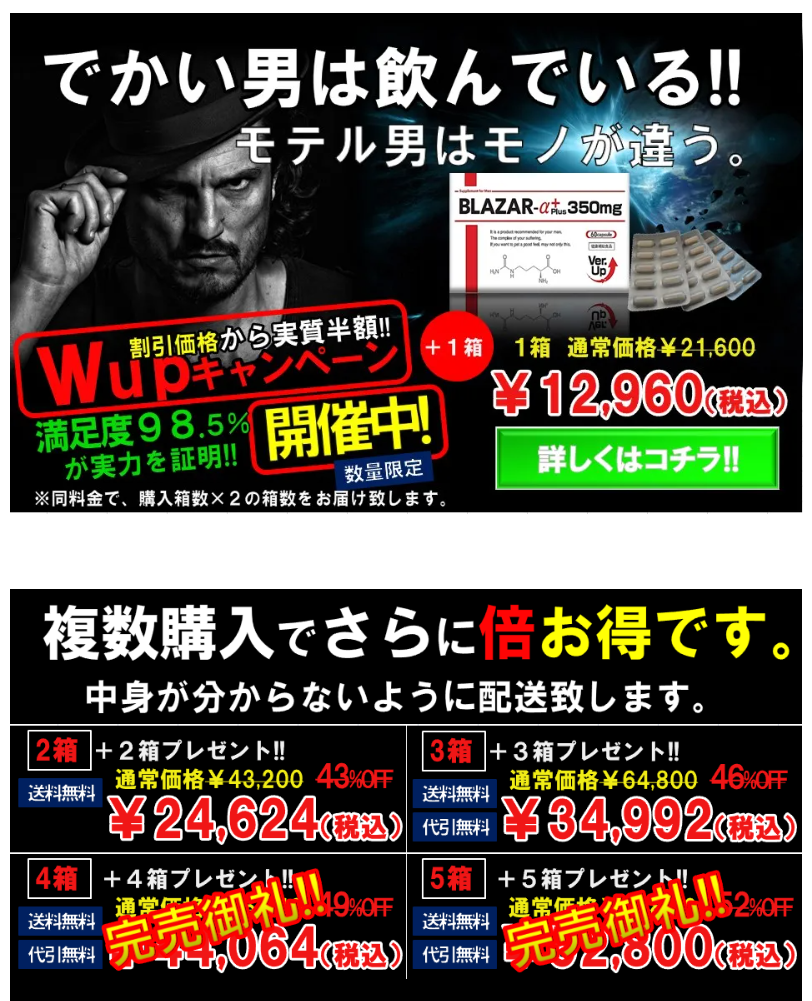 公式サイトはこちら BLAZAR-α+について サイズの悩みを、解消! 圧巻のサイズUP!! 厳選された、成分のみを特殊配合!! 圧巻のサイズUP力! あなたの強い味方! サイズUP成功者続々!! あなたも、是非実感してください!! 商品名 BLAZAR-α+ カテゴリ 健康食品
