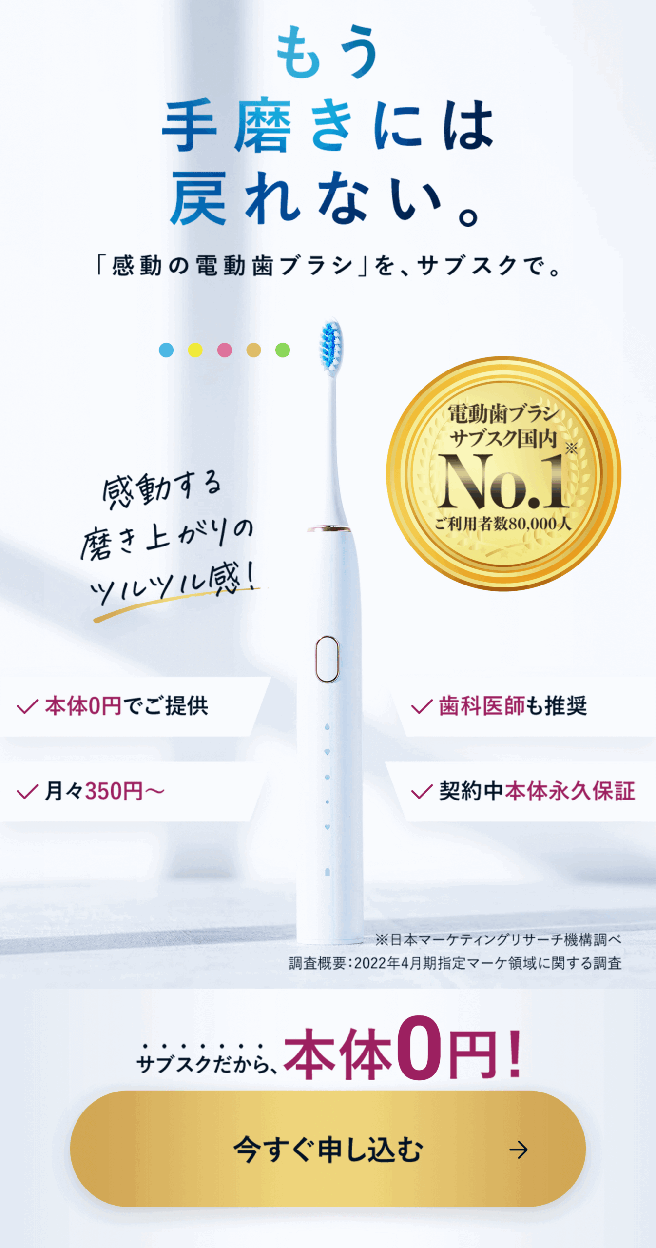 公式サイトはこちら GALLEIDO DENTAL MEMBERについて ○実績 ・ご利用者数80,000人 ・電動歯ブラシサブスク国内No.1 ・メディア掲載多数 ○価格 ・本体価格:無料¥0 ・替え歯ブラシ(1本あたり):350~400円 ・送料無料 ○特徴 ・手磨きの約100倍の洗浄力! ・歯ブラシスタンドにもなるワイヤレス充電器付き ○詳細情報 ・電動歯ブラシのサブスク GALLEIDO DENTAL MEMBER ・本体価格無料+月額350円で始める感動体験。 ・これまでありそうでなかった日用品のサブスクリプション。 商品名 GALLEIDO DENTAL MEMBER カテゴリ 健康グッズ